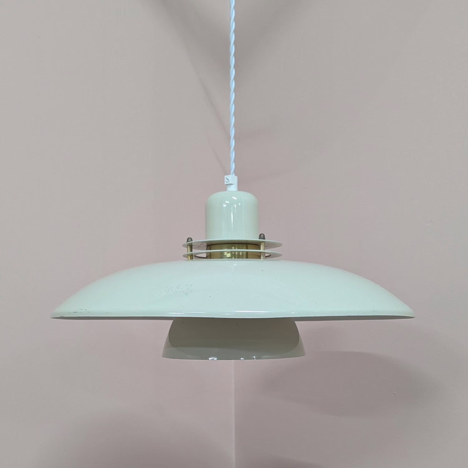 This authentic, large, off-white, pendant shade is designed to make a statement when hung from the ceiling. It was imported from Denmark and dates from the 1970s. The lower tier along with the spout at the top mean that, when switched on, the light diffused out at the different levels, creating glowing bands as well as downward illumination. A striking design that looks both midcentury and modern. It’s been rewired with a generous length of braided, fabric-coated flex ready to wire into position.