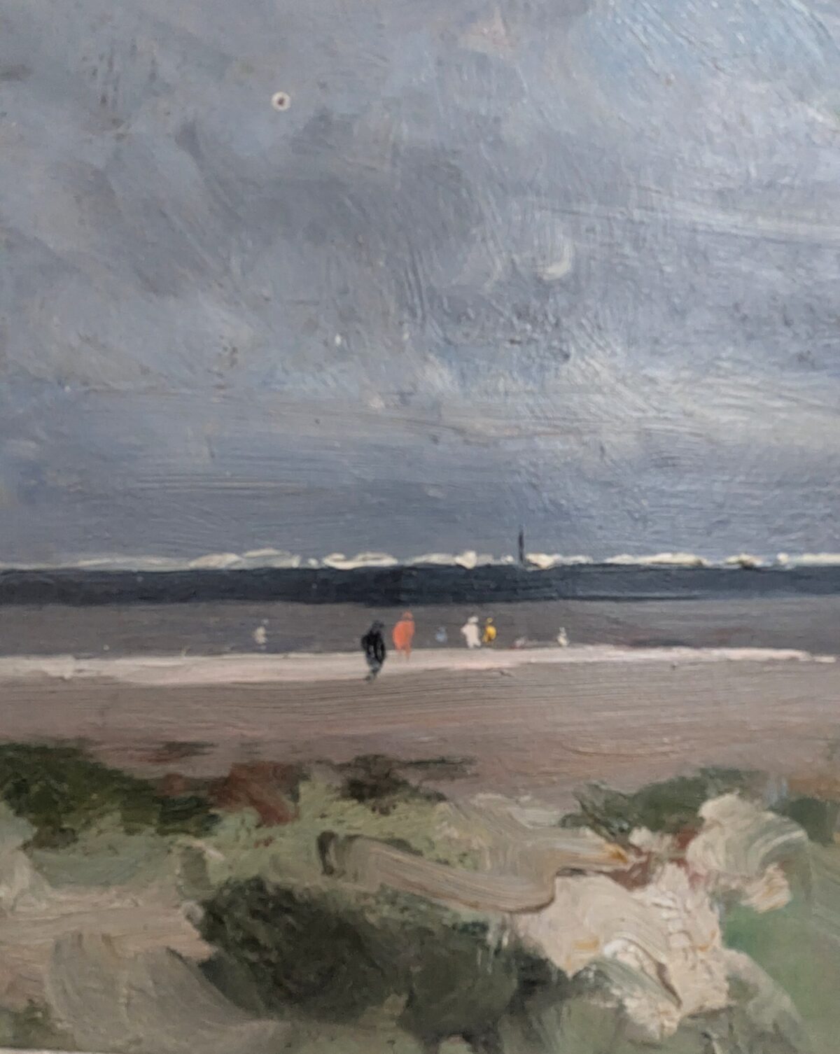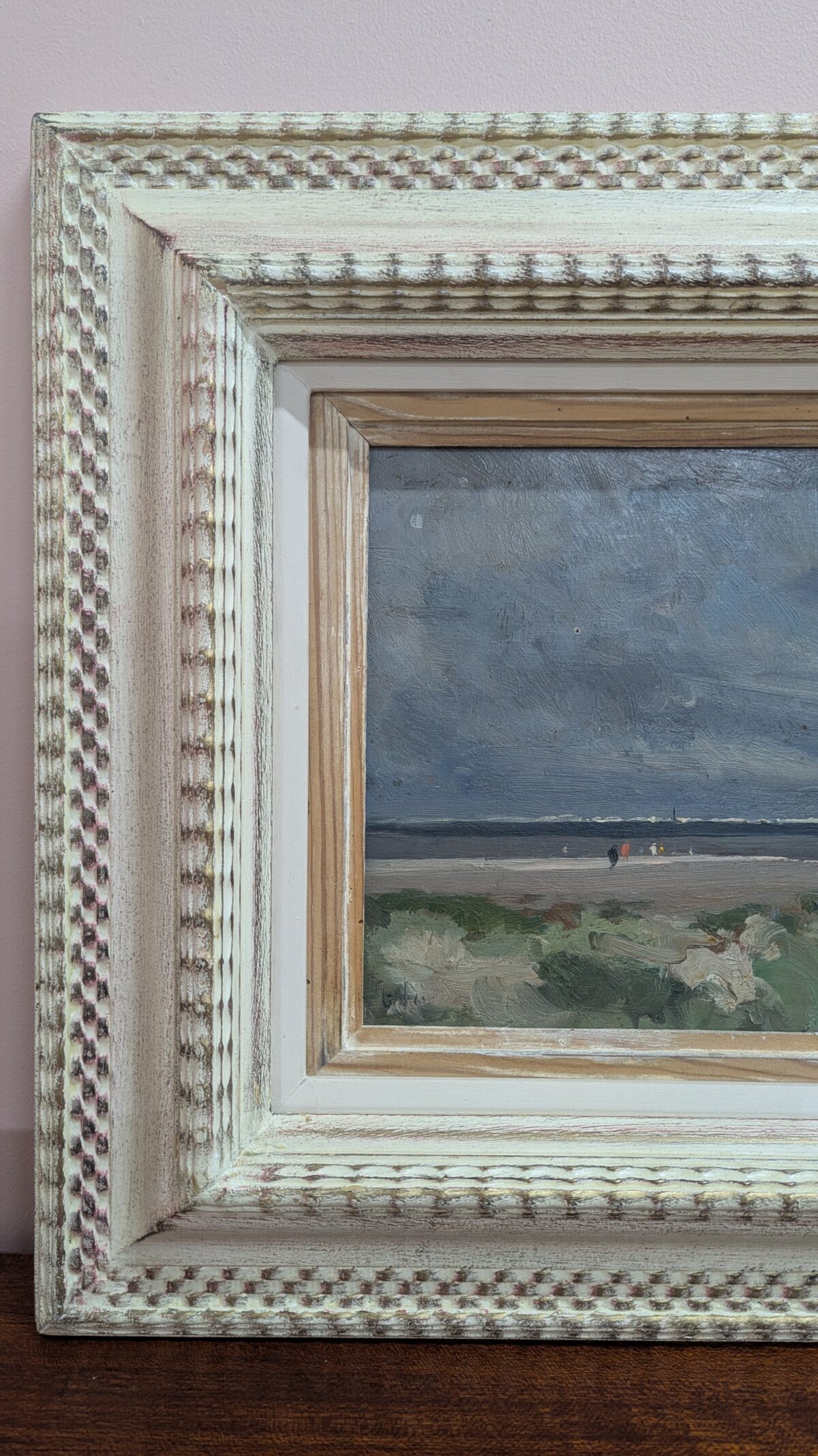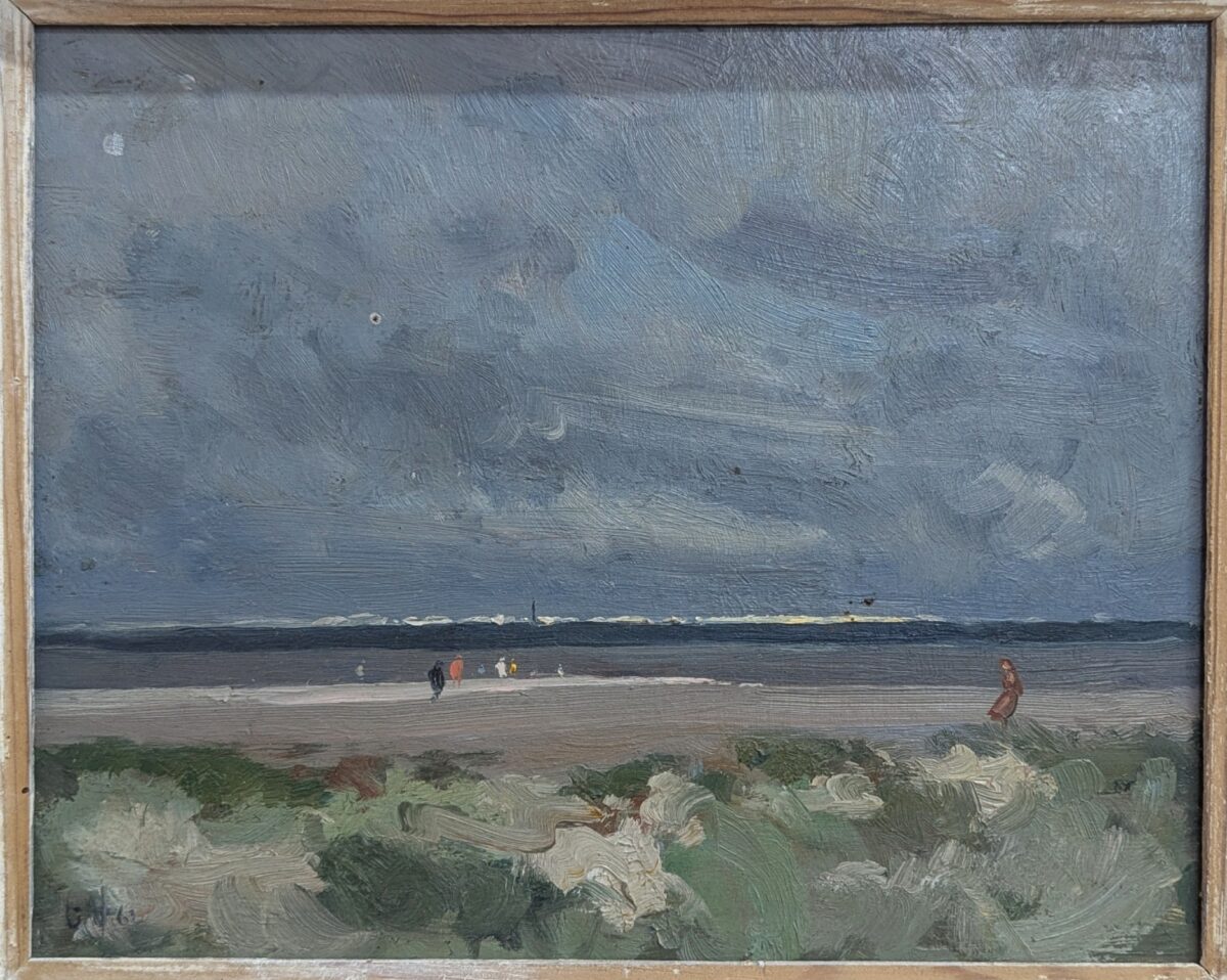What’s the story? Depicting a cloudy coastal landscape, quite feasibly the beach at Wells, Norfolk, as it was acquired locally and the grassy sand dunes and long-stretching beach are very reminiscent of it there, this is a dreamy, perhaps moody, oil painting. We can see several figures strolling in the distance along the shoreline, taking in the sea air. Skilfully painted by someone who understood how use the textures of their brush marks to convey a place's atmosphere and space. We love the colour palette of soft blues, greys and greens, punctuated by specs of colour in the coats the people are wearing. The sky in particular is beautifully painted. It comes professionally mounted in a handsome floating frame that complements the canvas very well indeed. It is initialled GV and dates '62 although sadly this has no led us to the artist. Free UK Delivery!£125.00 -