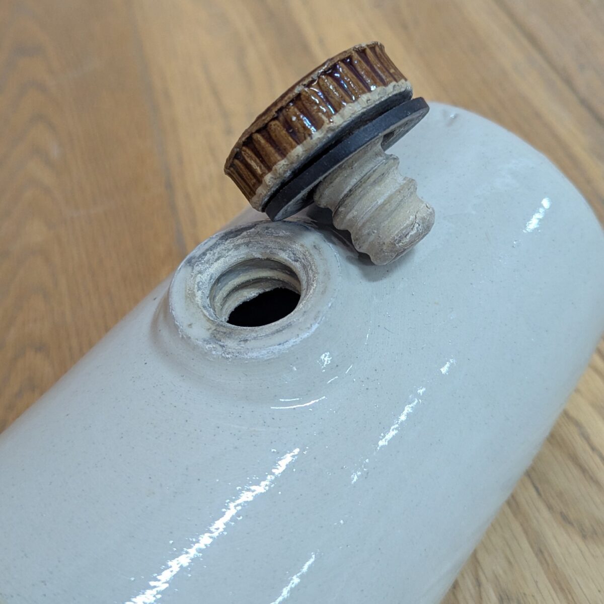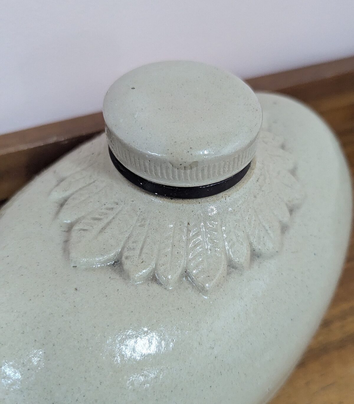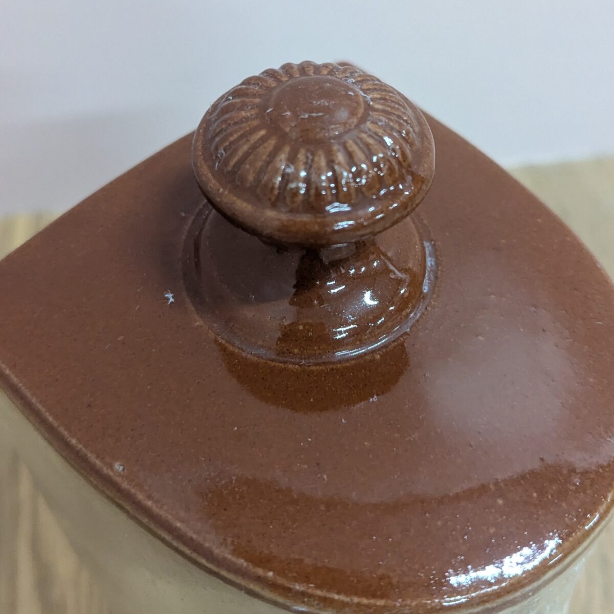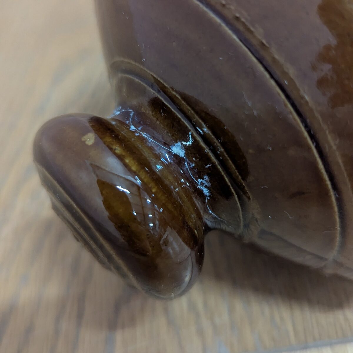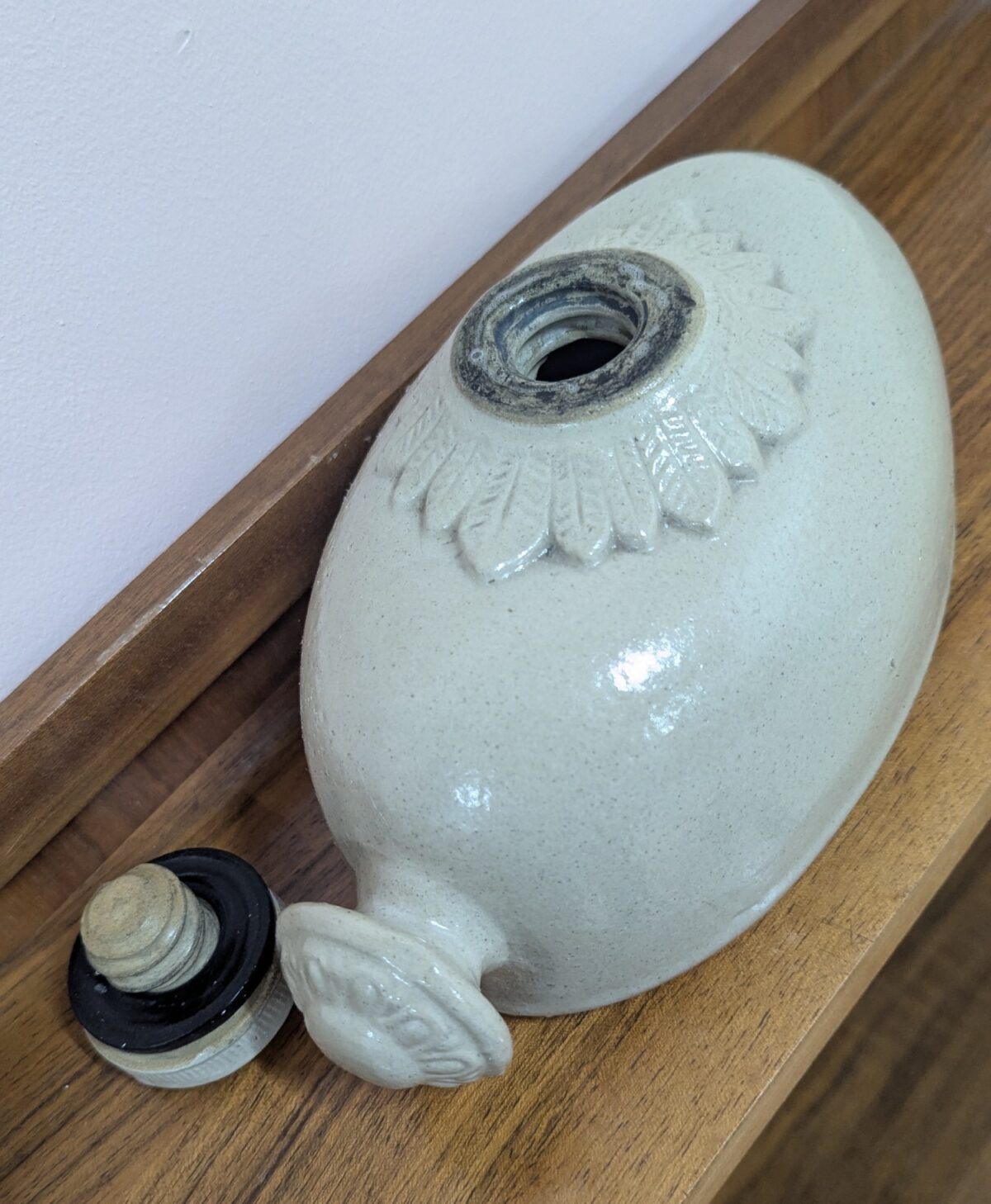 • What’s the story? From a bygone era, these stoneware bottles were once filled with hot water and used to warm your feet or your bed (or both!). It’s the original hot water bottle used from Victorian times through to the 1950's until flat rubber ones came along. This two pint bottle comes with its original stopper. It has a two-tone glaze in cream and brown with relief decoration around the carrying knob and a design that’s plain, durable and functional. It's a little worn and cracked as seen in our photos and this is reflected in our price but regardless, this is ideal for the rustic, cottage core look.   Free UK Delivery!