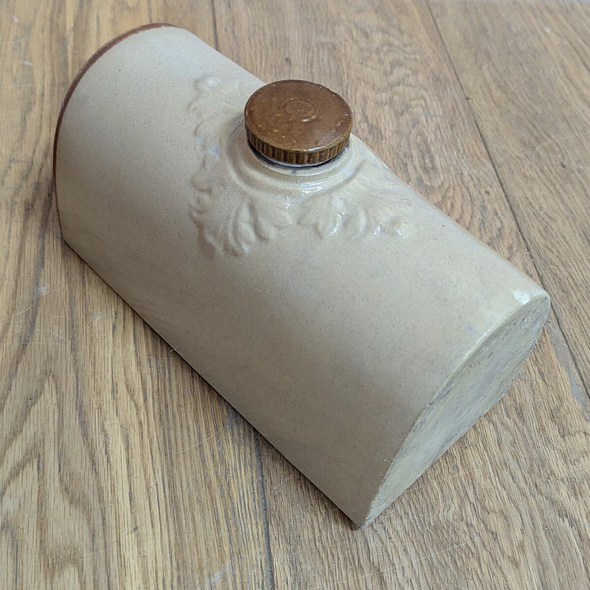 • What’s the story? From another time, these stoneware bottles were filled with hot water and used to warm your feet or your bed (or both!). It's the original hot water bottle used from Victorian times through to the 1950s until flat rubber ones came along. This particular three pint bottle comes in great order with its original stopper in place. It was made by Denby and features a two-tone glaze in cream and brown with relief decoration around the stopper and on the carrying knob. Perfect for the cottage core look, they are stylish decorative objects nowadays and also make reliable door stops.     Free UK Delivery!
