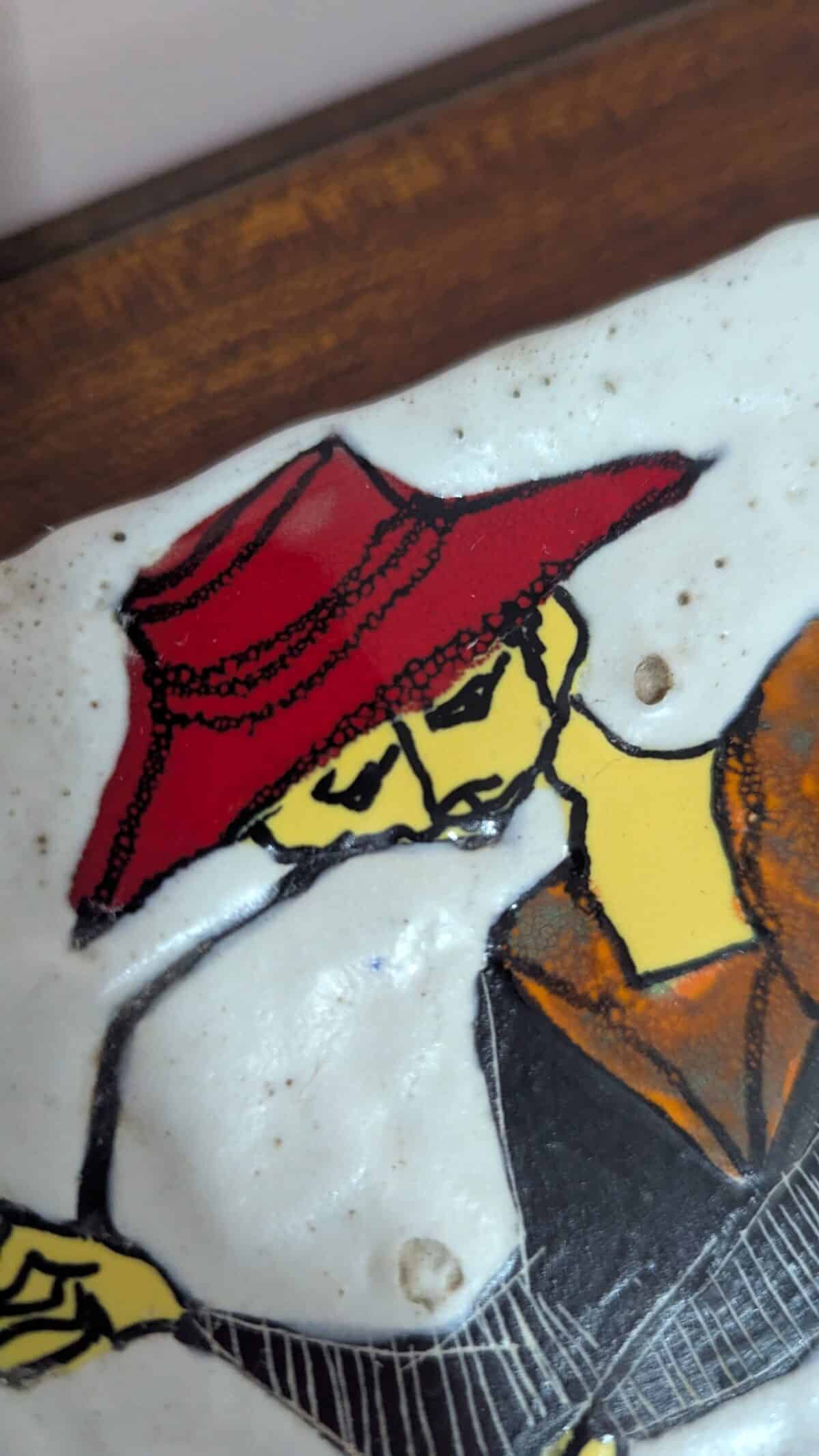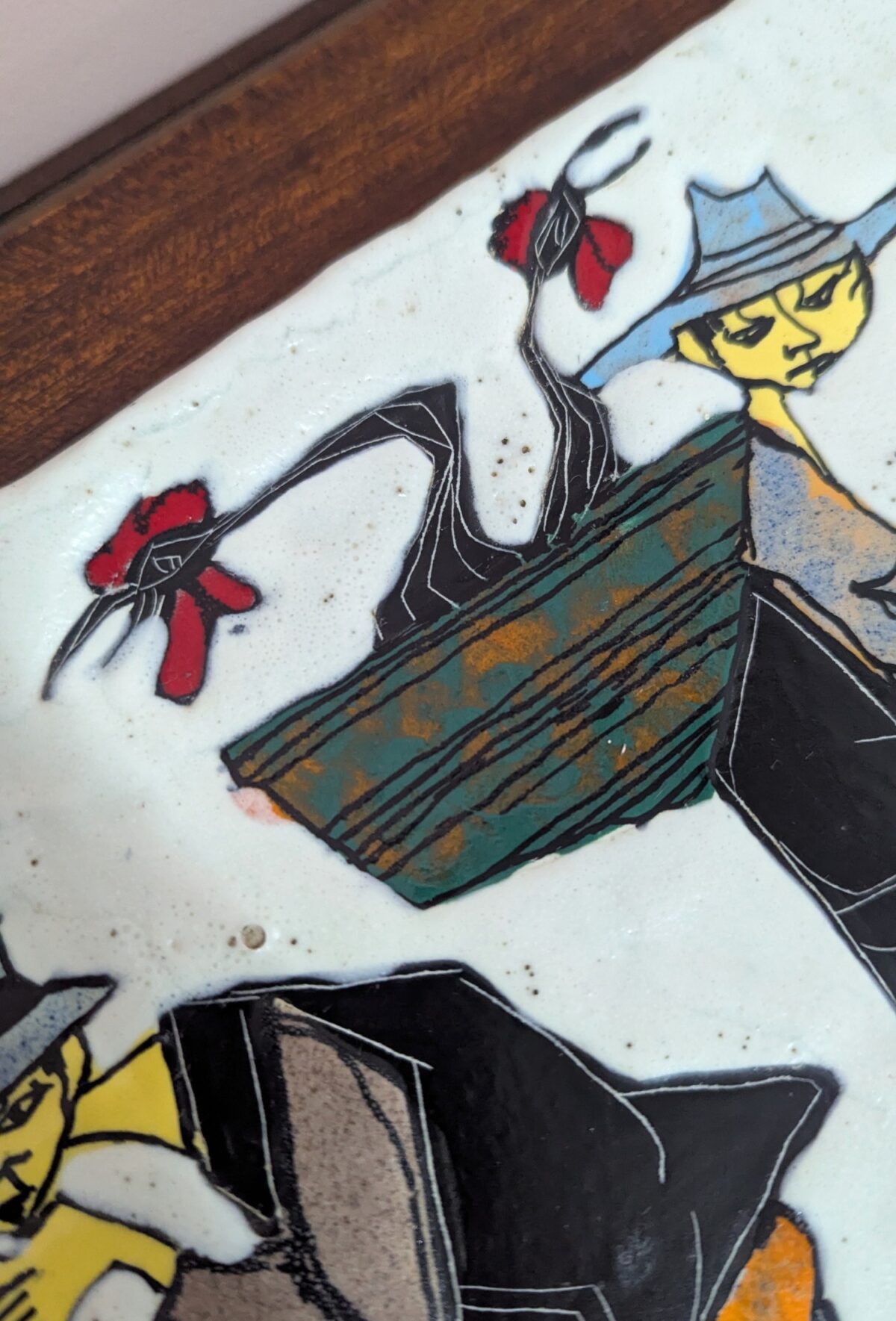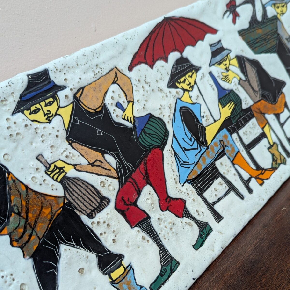 • What’s the story? There is great deal to love about this European, midcentury, ceramic wall plaque. It hails from San Marino, dates from the fifties and we believe it is by produced by SAM.  Illustrating a bustling Chinese street scene, it's full of life, movement and colour. And the colours are extraordinary, vivid and bright. The various characters depicted have so much character without becoming cartoonish. They're superbly drawn. The background has an unusual textured, bubbled surface, further adding to its appeal. Our favourite thing... the two angry roosters in the man's basket on his back. On the reverse, thread is cleverly looped through the pottery slab for hanging.     Free UK Delivery!