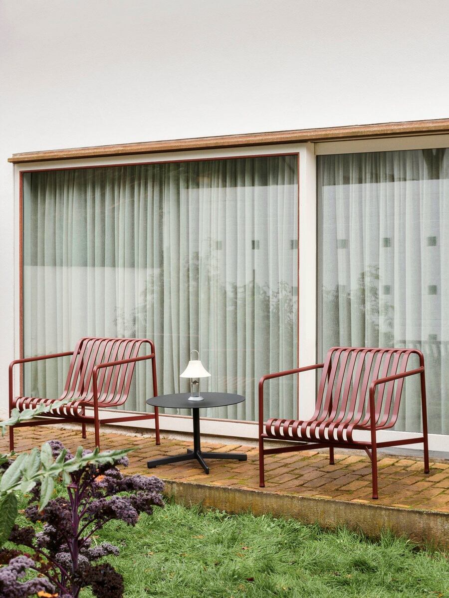 The Steel Garden Armchair by HAY from the Palissade collection is crafted from powder-coated steel, designed to last outdoors and maintain its style.