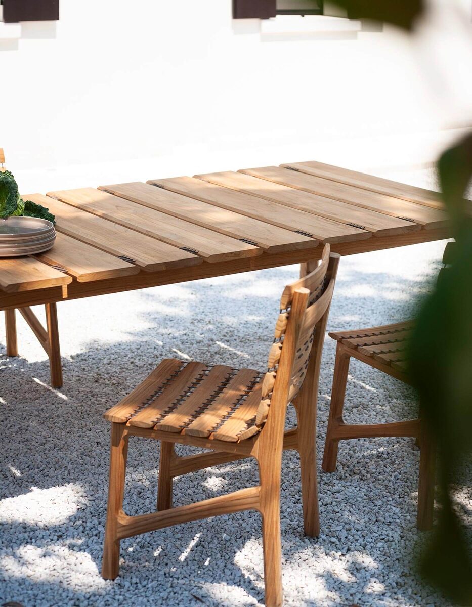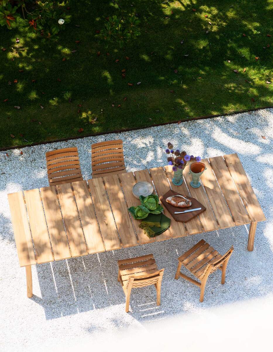The Teak Garden Table by RODA is crafted from solid teak with clean lines and a robust silhouette. Ideal for outdoor gatherings.