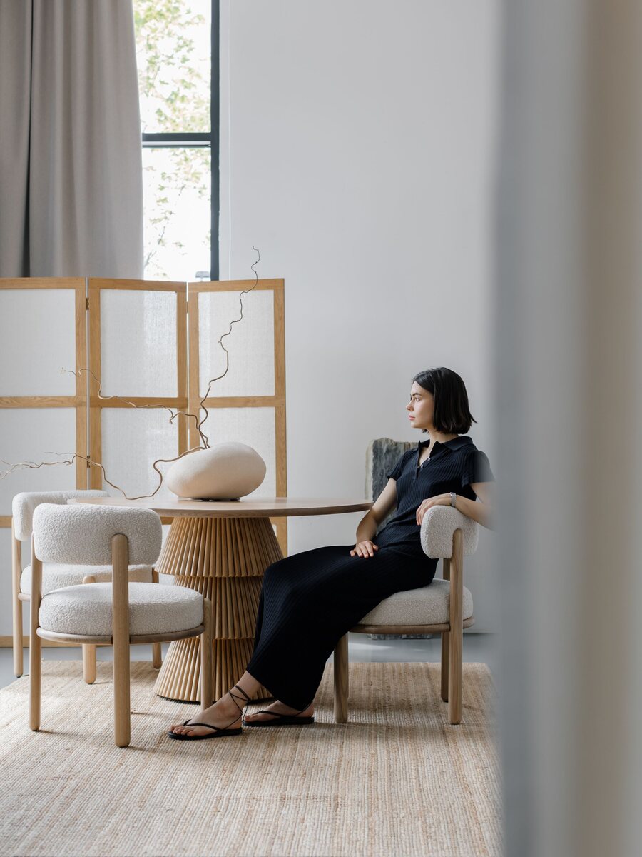 The Strikha Round Oak Dining Table, designed by Kononenko ID for Tivoli, draws inspiration from ancient Ukrainian cottages, incorporating elements reminiscent of thatched roofs. Crafted from solid oak, this table features a distinctive tiered base that adds a sculptural quality to its design. The handcrafted nature of the piece ensures uniqueness, making it a standout addition to any dining space.