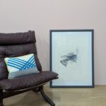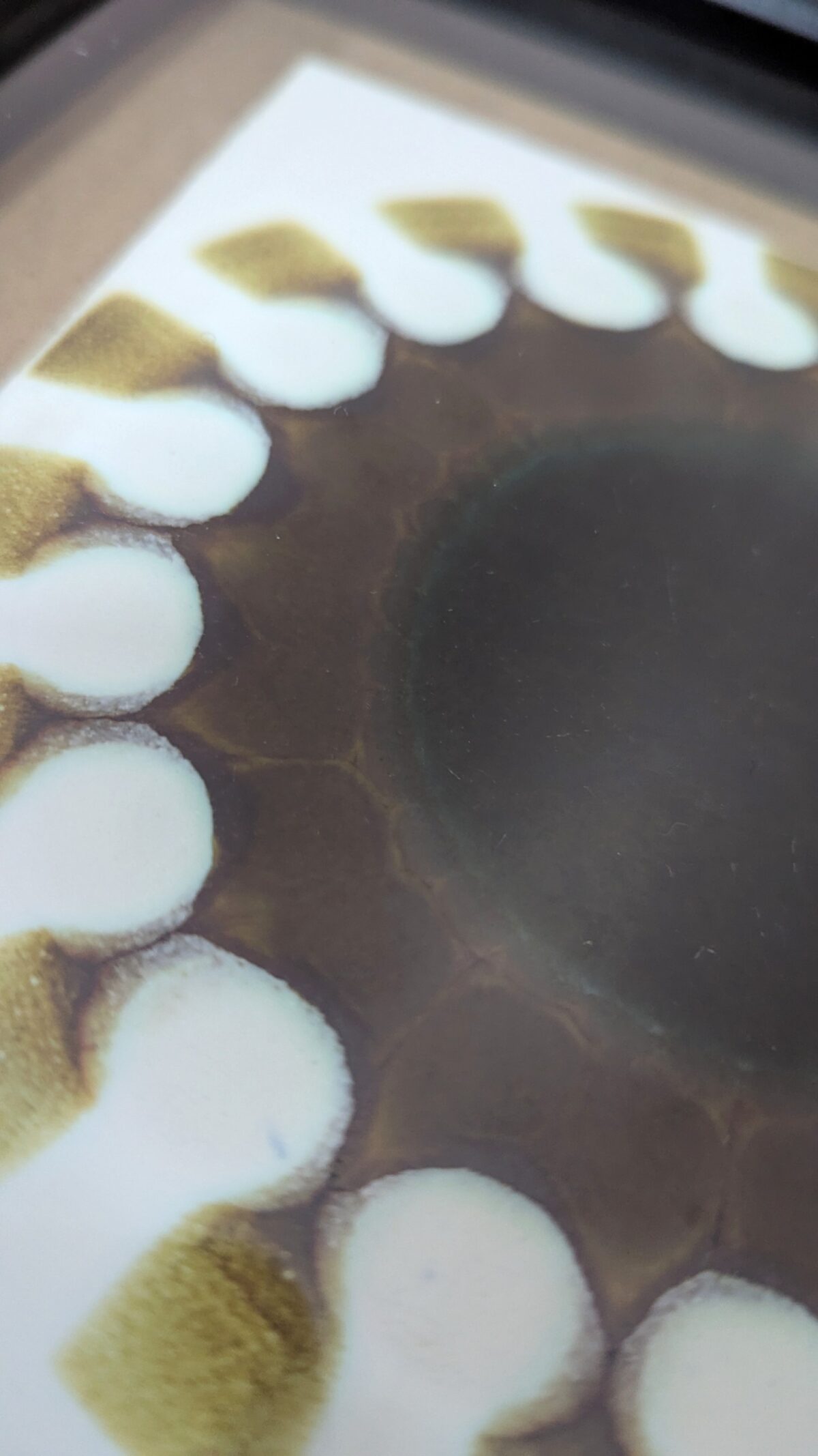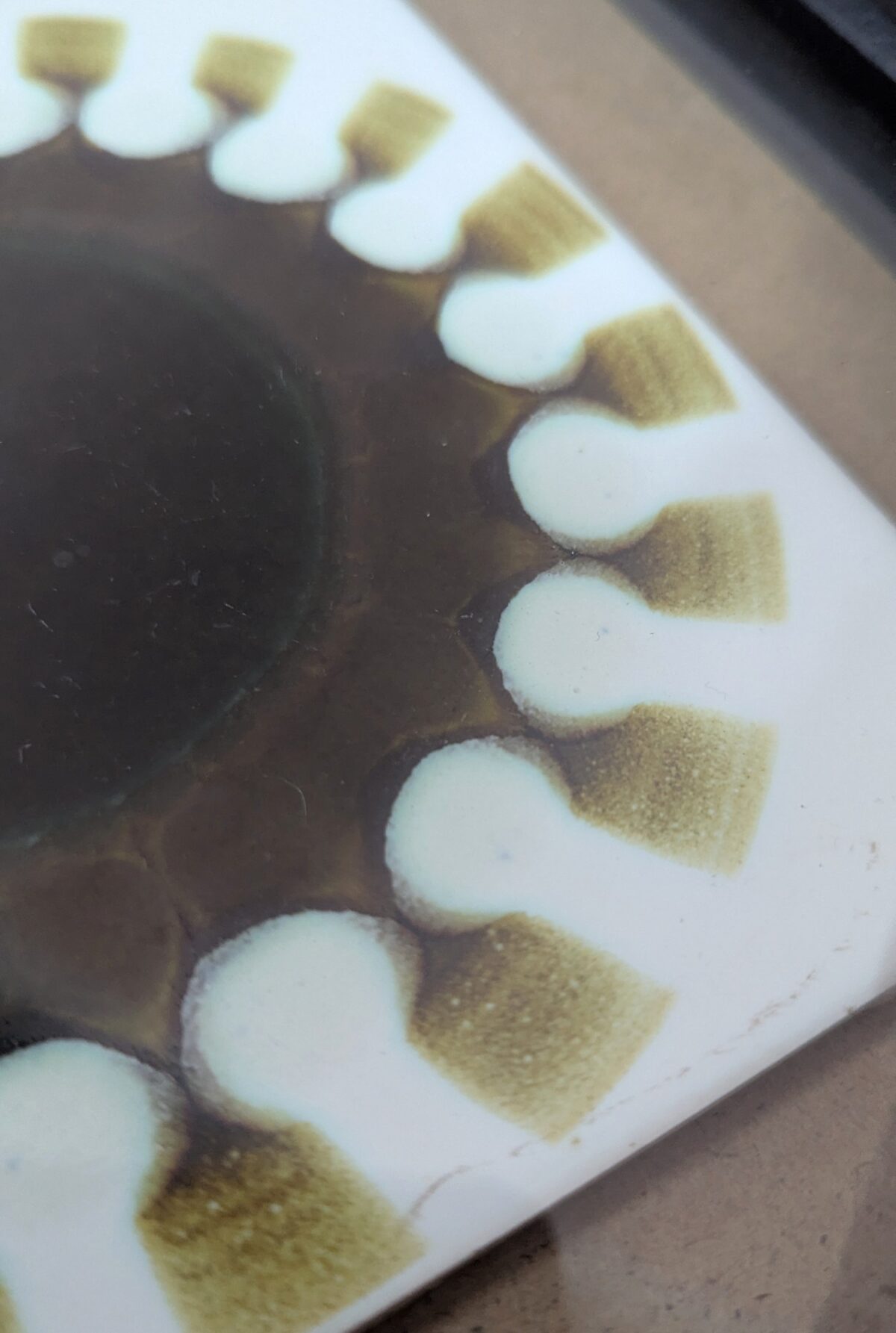 This midcentury ceramic tile looks splendid framed, transformed into a work of art… and it is. Designed by British studio potter, Alan Wallmark, and produced by Pilkington, he hand-painted lots of variations of this sunburst theme in different glazes and hues. This is a particularly attractive one with a deep, dark teal centre radiating out into blurred mustard ‘feathers’ around the circle’s circumference. Lovely condition and very much of its time, it dates to 1968.