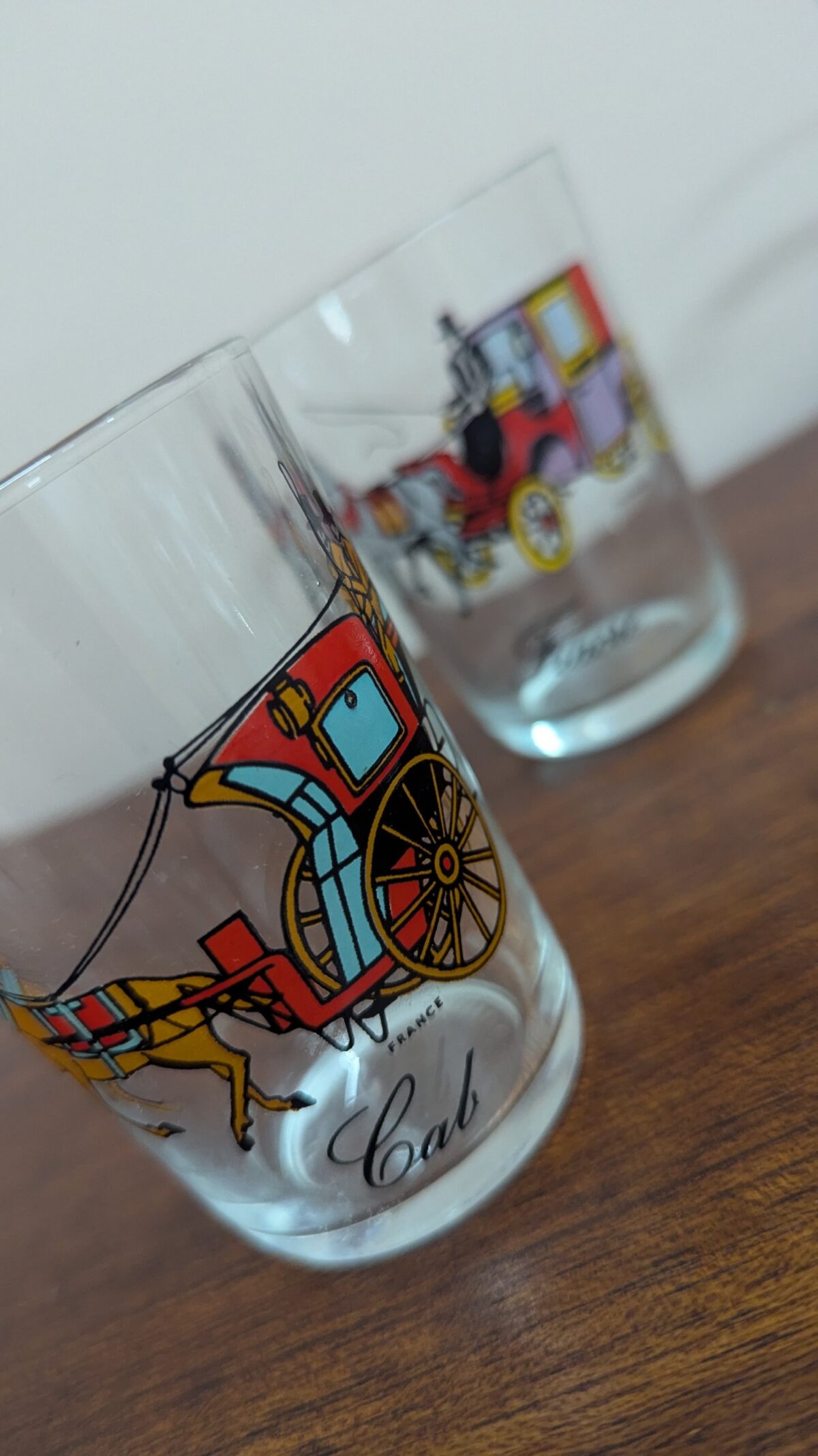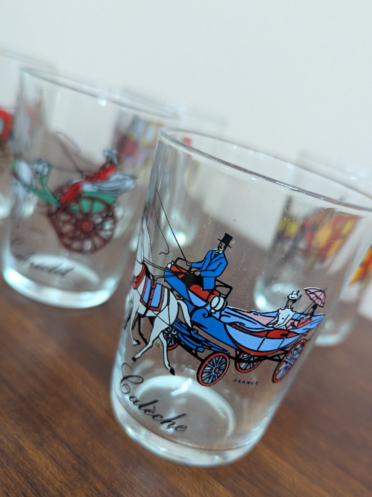 Giving a whole lot of 1970’s kitschness are these fabulous French shot or small tumbler glasses. Each features a different, colourful horse-drawn carriage illustration – cabriolet, fiacre, caleche, mail coach and cab.