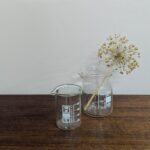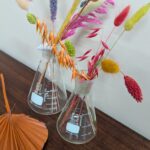 For a big clustered impact, we have a set of five tall, thin, school science lab, volumetric flasks. These are just perfect for single stems. We love the blue 250ml stamp on each flask, reminding of of their former lives. A lot of fun!