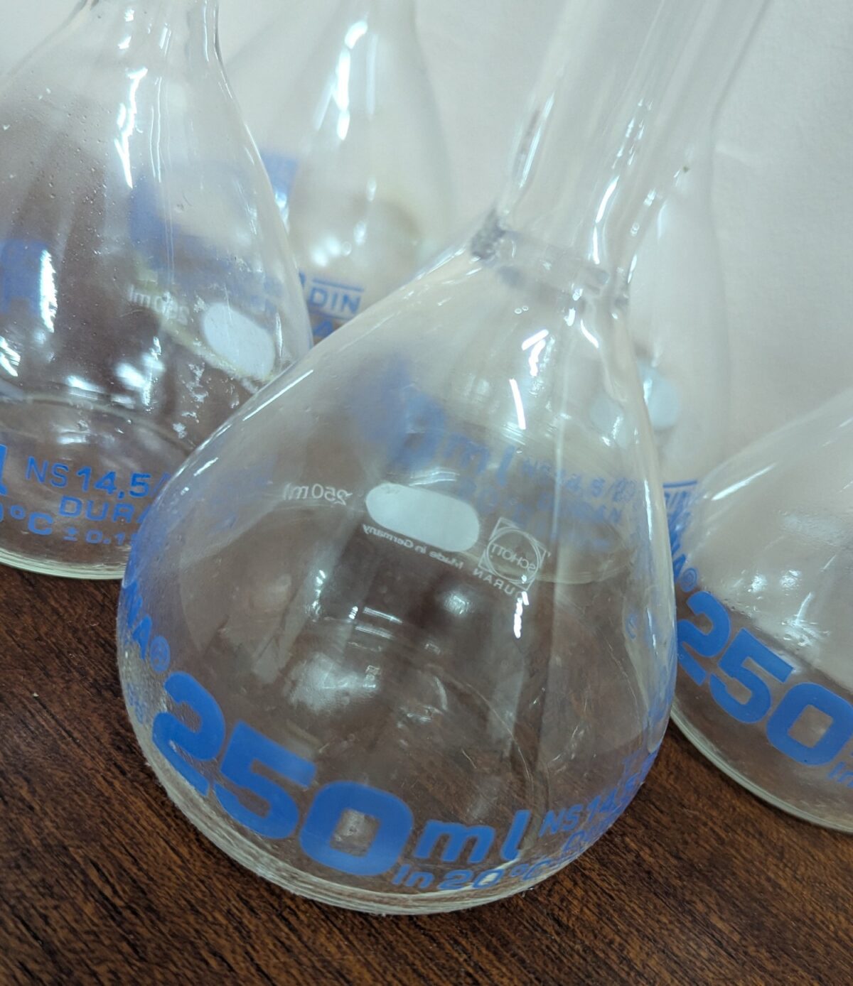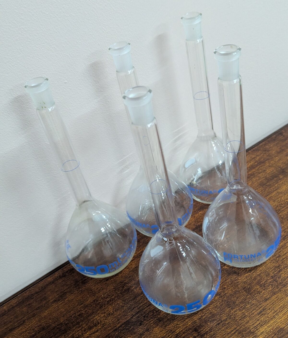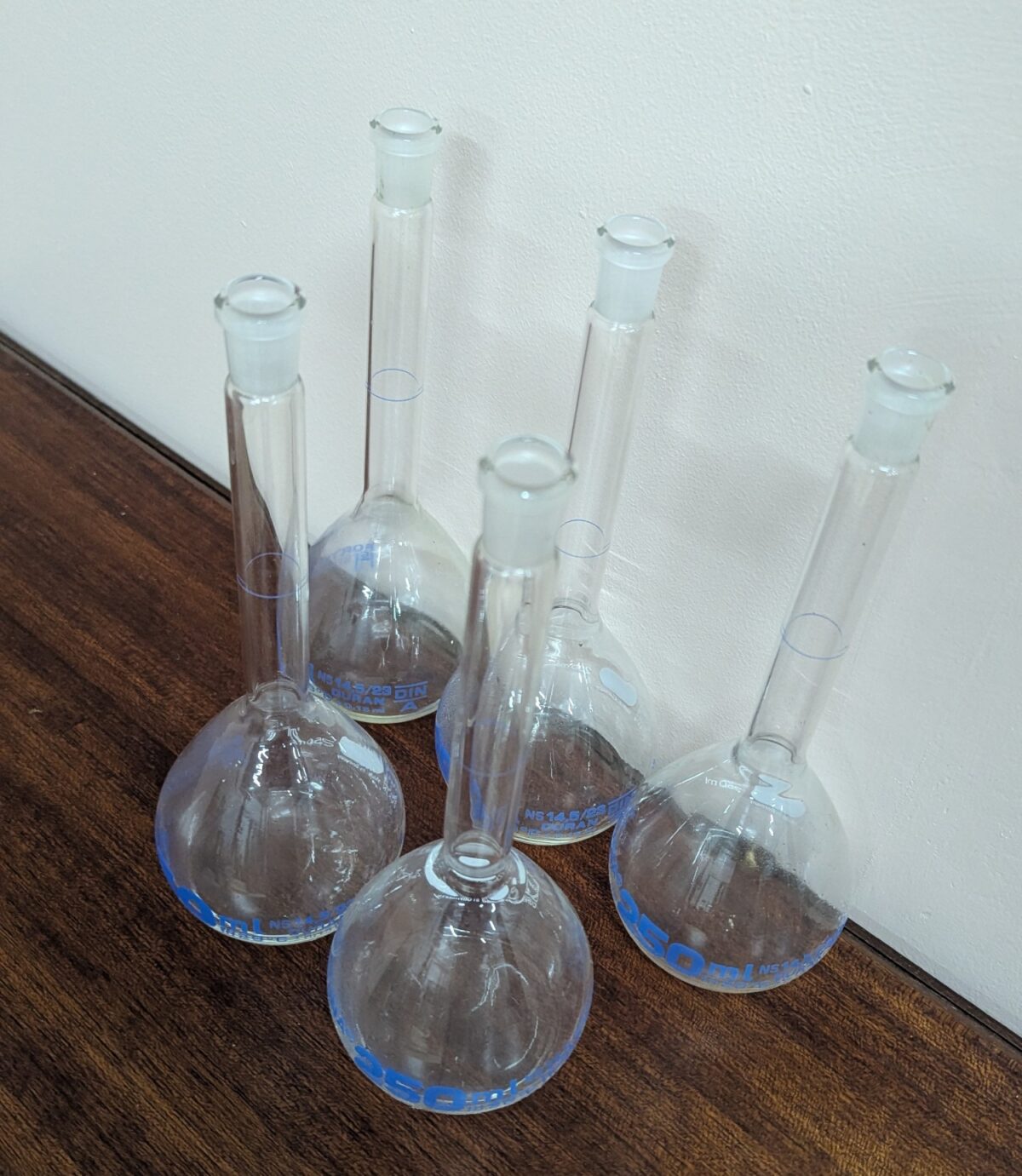 Set of Five Tall Science Lab Volumetric Glass Flasks